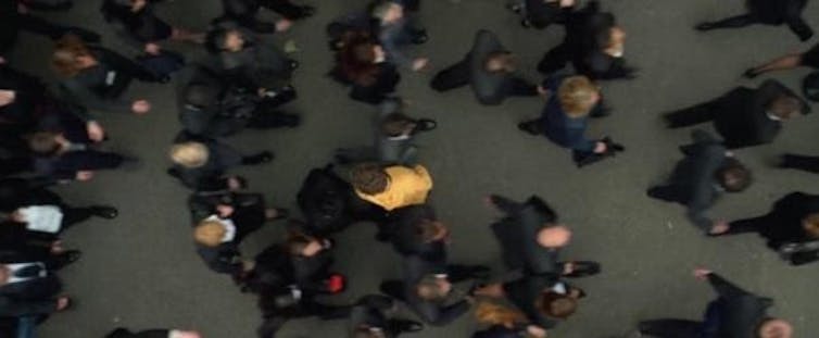 Son attitude est mise en scène à plusieurs reprises lorsqu’il se distingue en marchant à contre-courant de la masse grouillante des cadres en costumes gris qui partent travailler. Sébastien, c’est le petit mouton noir du début des Temps Modernes qui ne suit pas la meute et en appelle à une « éthique du déraillement ».